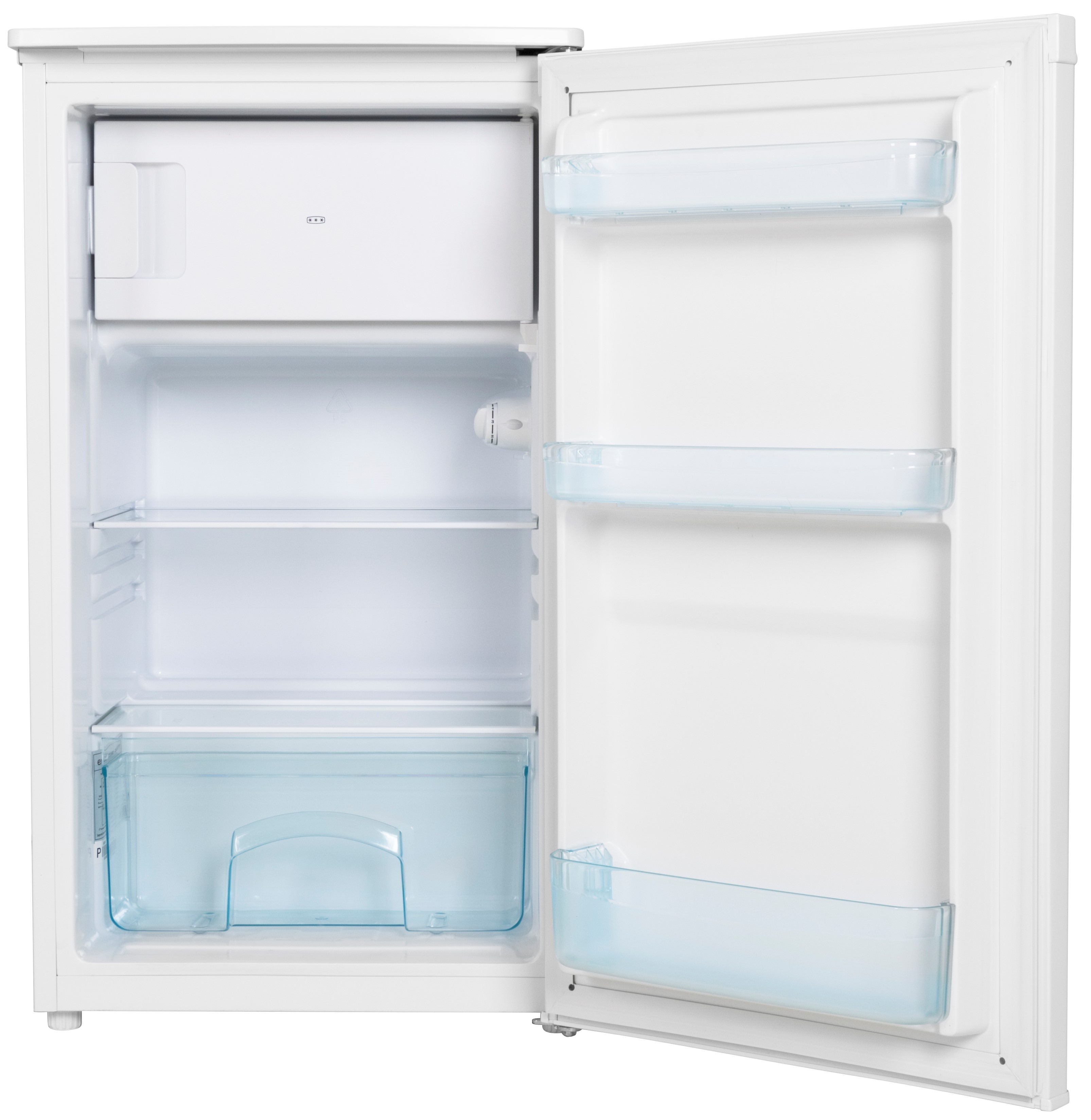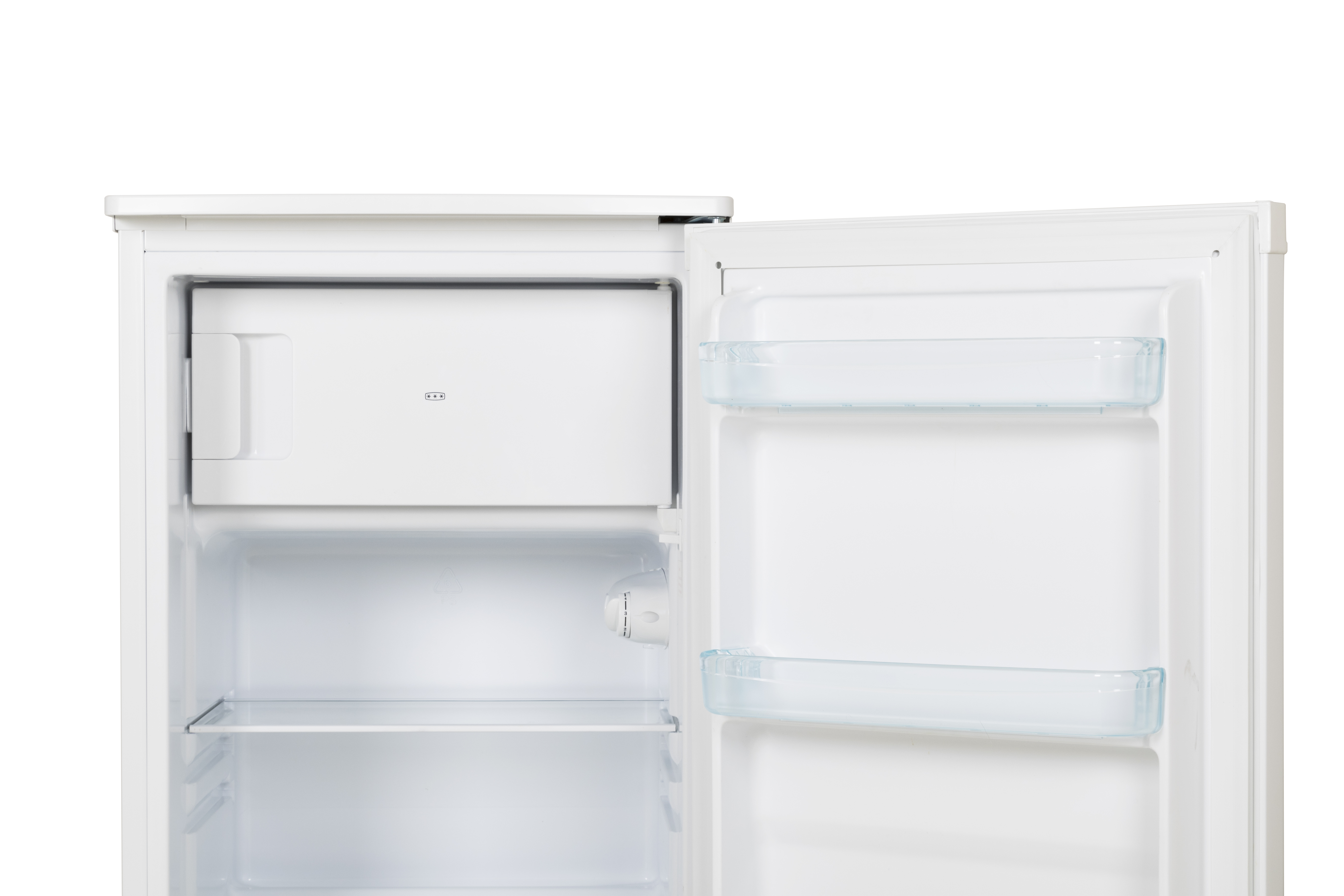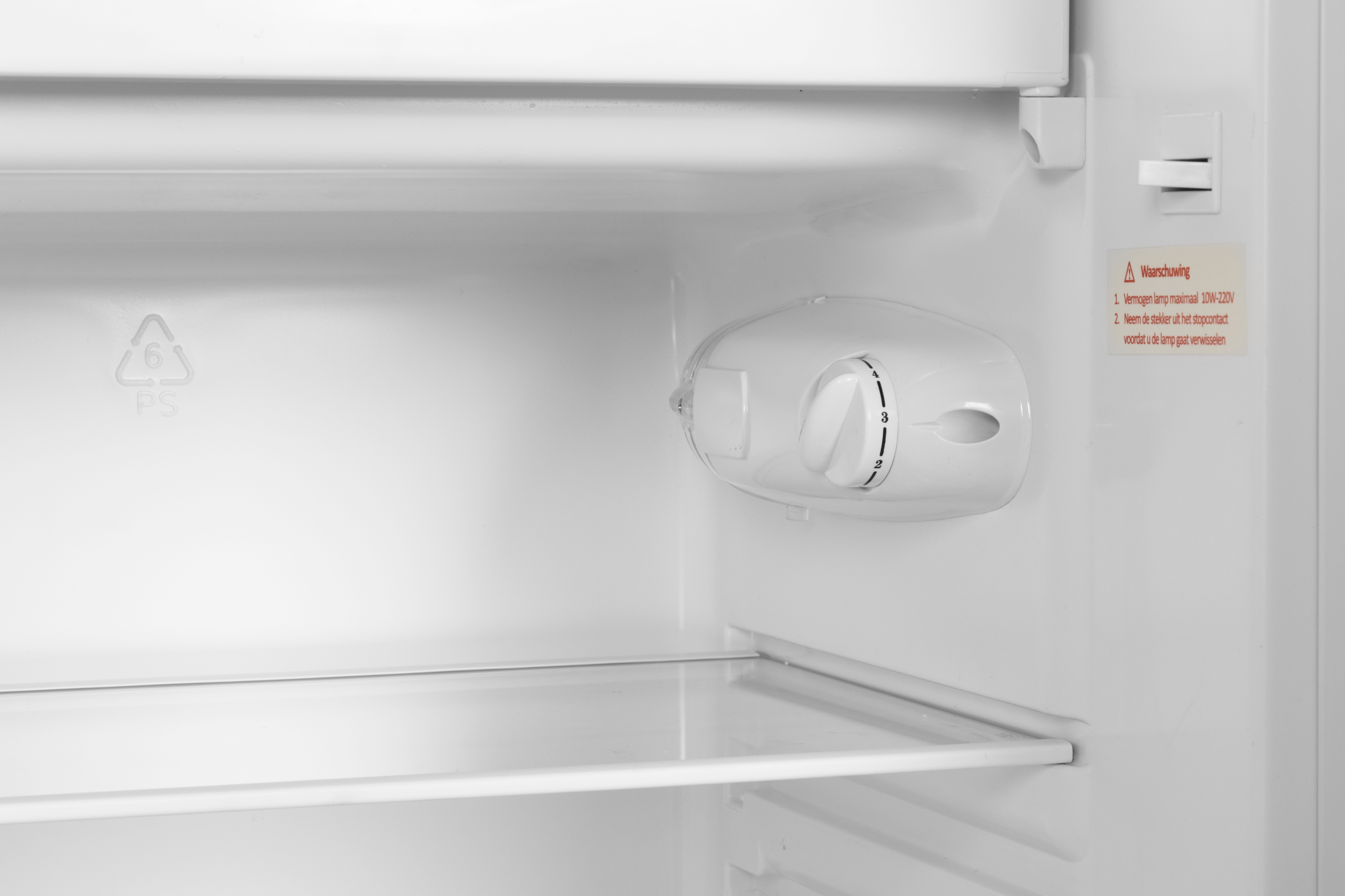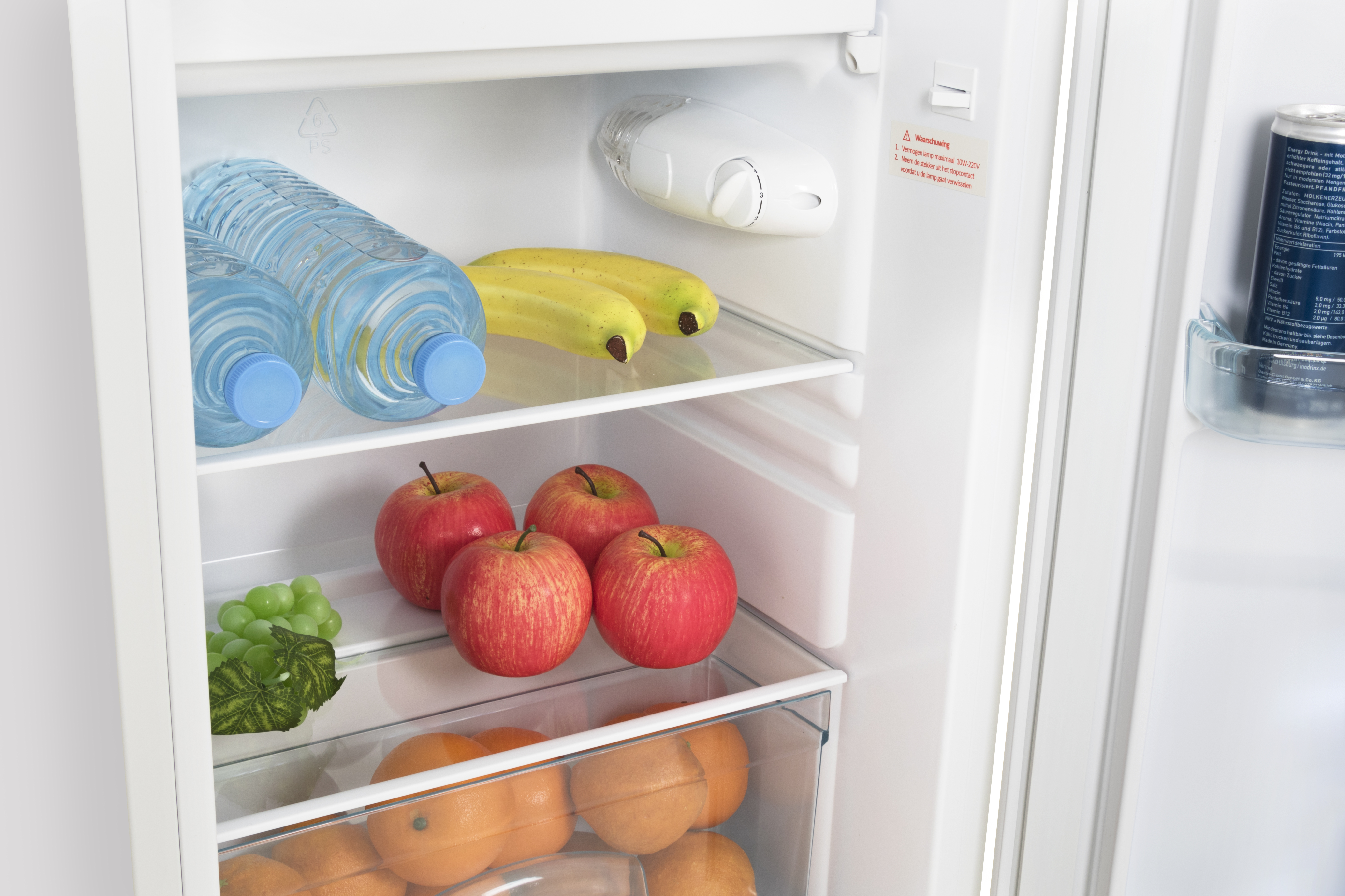 Dit smalle tafelmodel koelkast is geschikt voor een klein huishouden of als extra koelkast. Hij heeft een totale inhoud van 81 liter. Met de 2 verschillende legplateaus en 3 deurvakken, kunt u de koelkast naar eigen wens indelen. De koelkast is gemakkelijk te bedienen met de draaiknop binnen in de kast. Bovenin de koelkast zit een drie sterren vriesvak van 11 liter. De koelkast is strak afgewerkt met een geïntegreerde handgreep.
